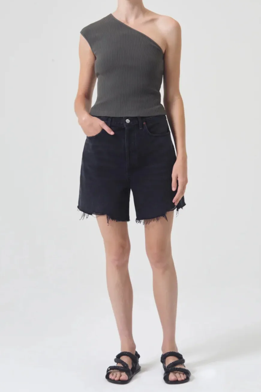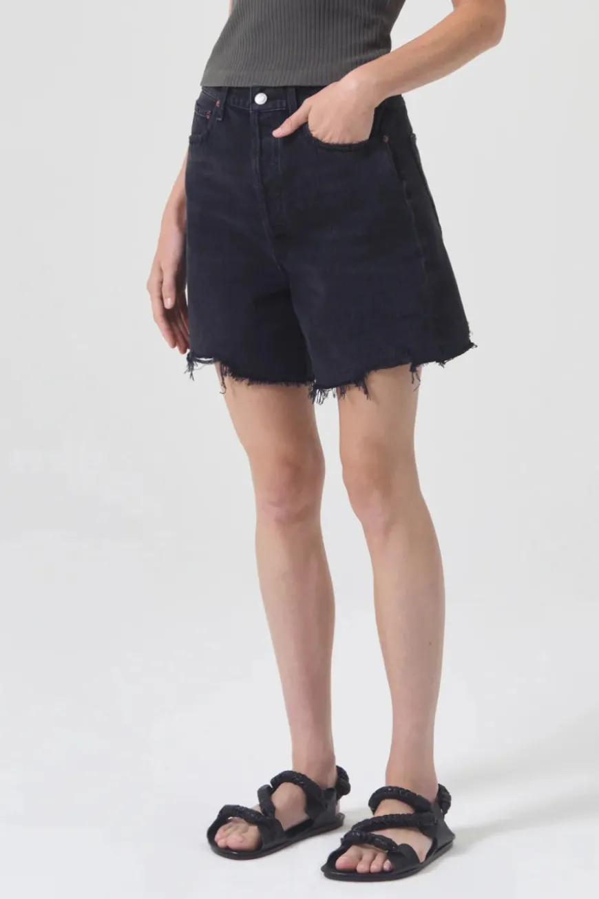 Relaxed fit shorts, cut from a rigid cotton denim. Featuring a high rise, wide legs with slightly longer in-seam, finished hem, zip fly, and classic 5 pocket detailing.