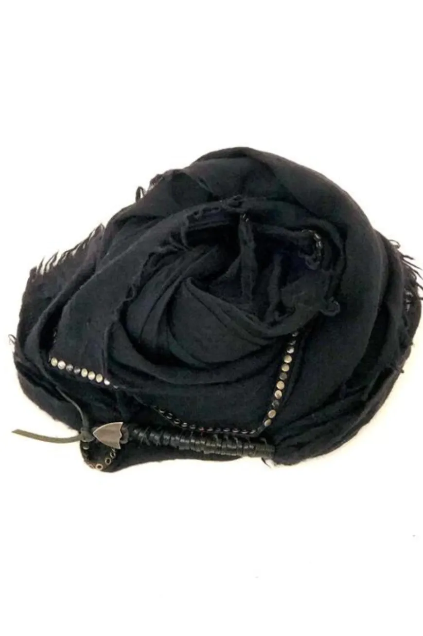 Black scarf with fringes, leather insert with metallic HTC Los Angeles logo. Dimension: 140 x 140 cm. Composition: 35% wool, 35% cashmere, 20% silk. Made in Italy.