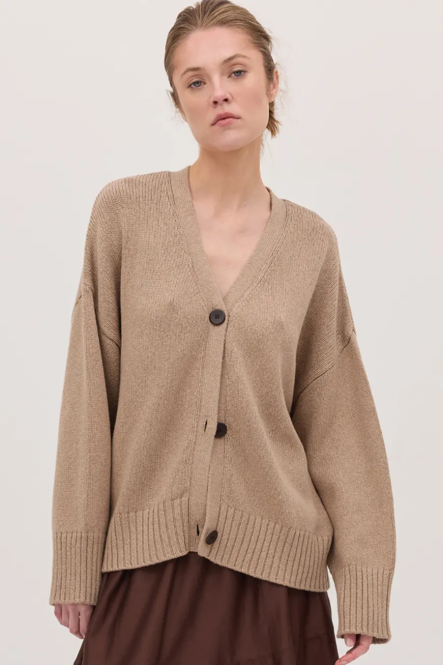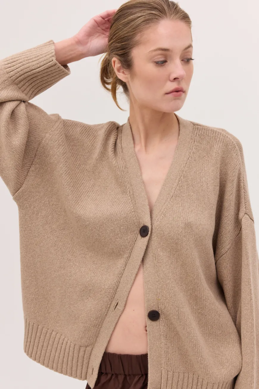 Made from a blend of 45% RWS merino wool and 55% organic cotton, this cardigan features corozo buttons and a timeless design. Perfect for layering or wearing on its own, it offers a soft, breathable fit and a refined, versatile style.