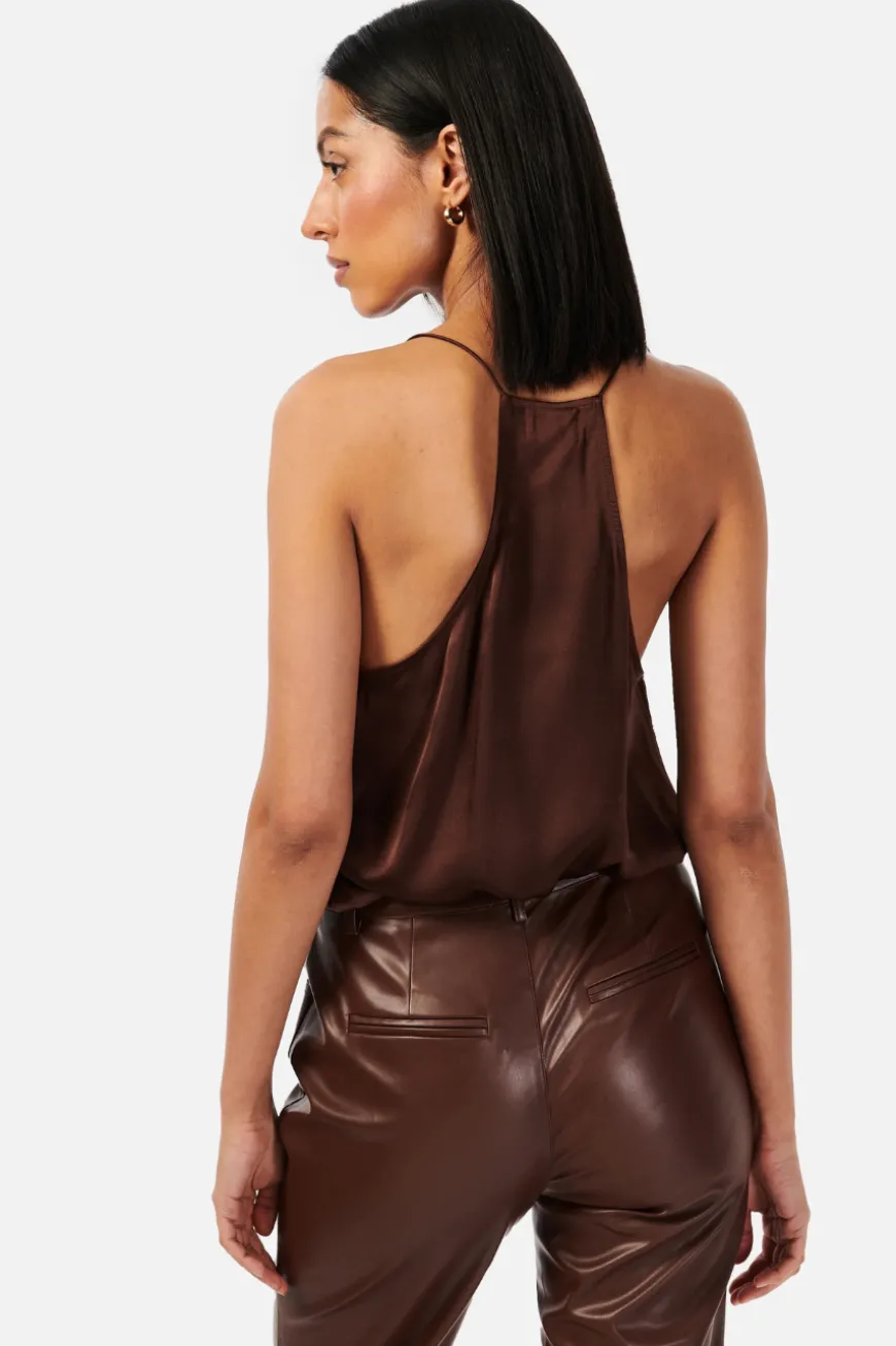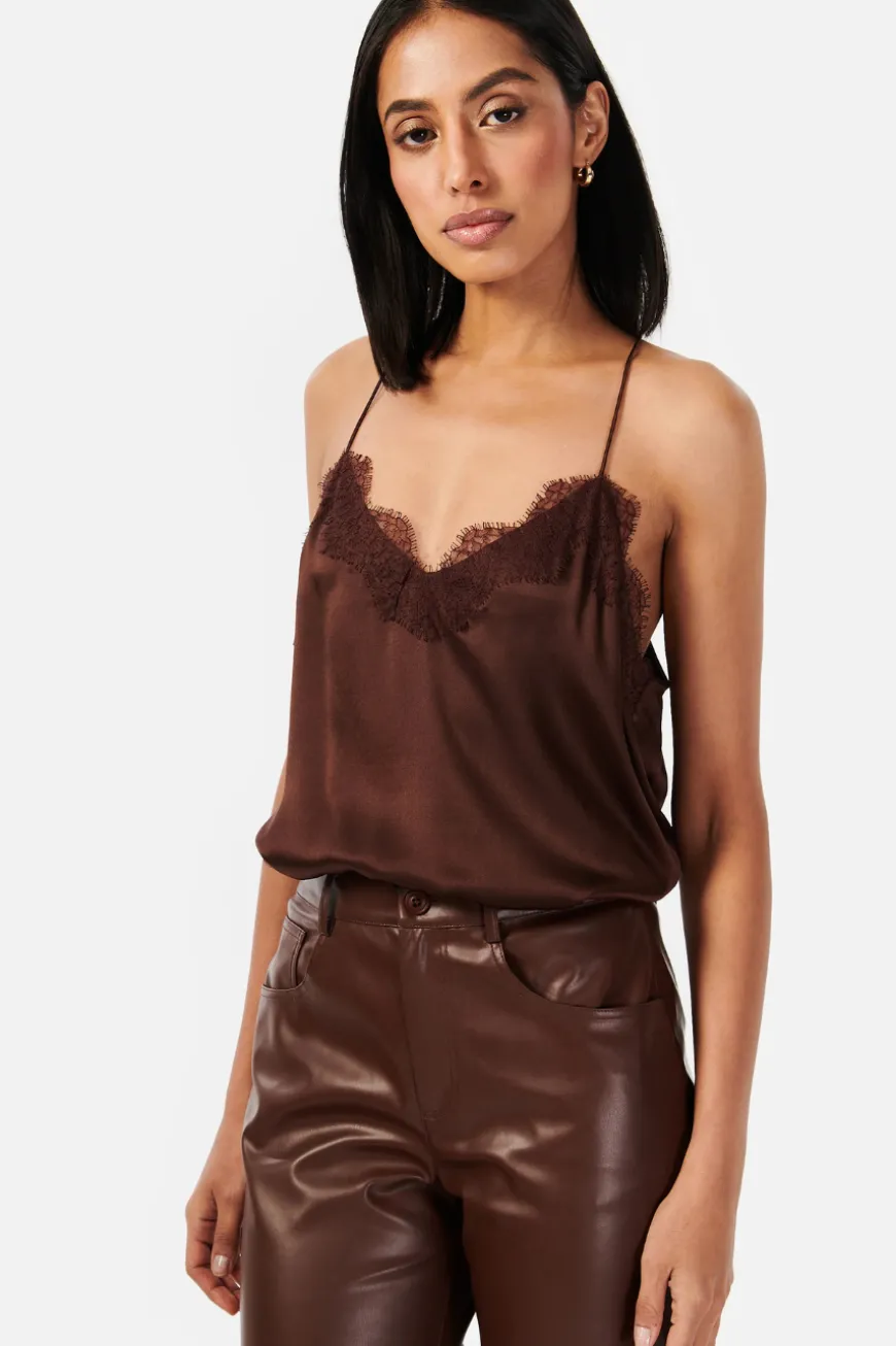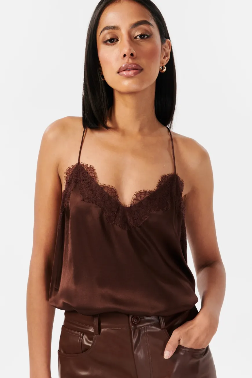 The Racer Charmeuse Cami is crafted in a silk sandwash charmeuse and features a V-neckline with delicate and feminine French lace trimming. This light-weight camisole style has a racer back construction and a relaxed fitting bodice. The perfect day to night wardrobe builder.