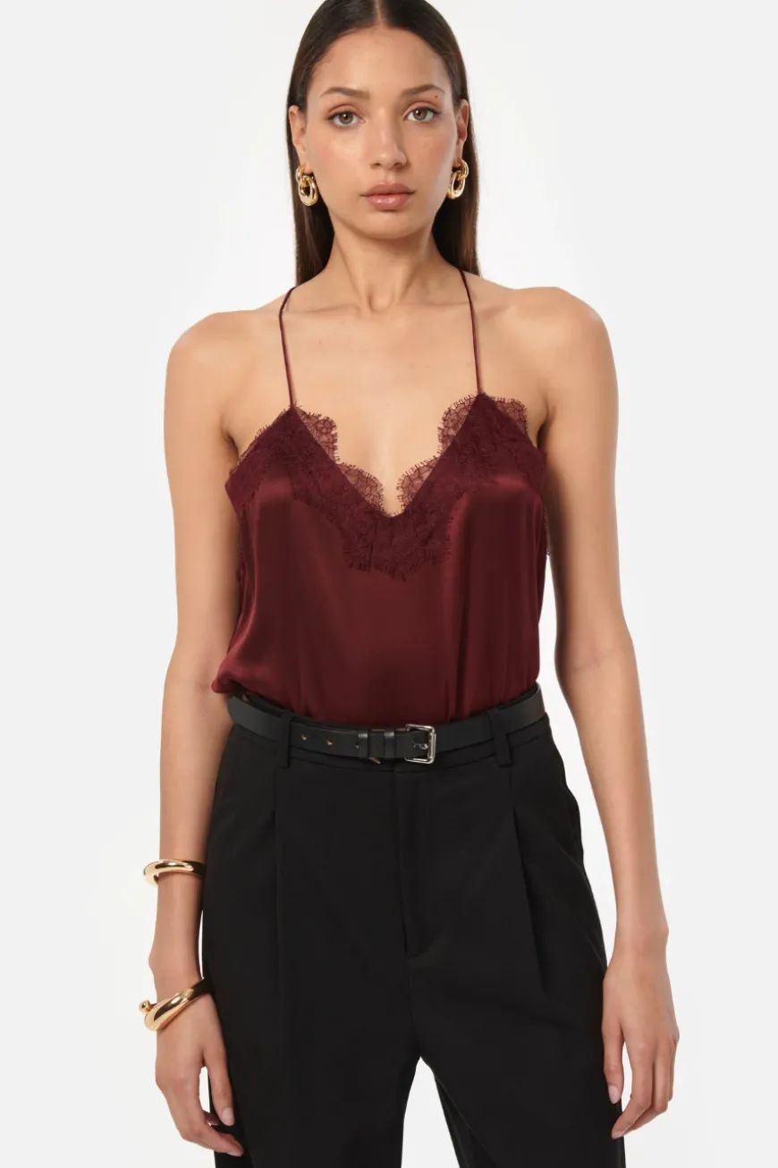 The Racer Charmeuse Cami is crafted in a silk sandwash charmeuse and features a V-neckline with delicate and feminine French lace trimming. This light-weight camisole style has a racer back construction and a relaxed fitting bodice. The perfect day to night wardrobe builder.