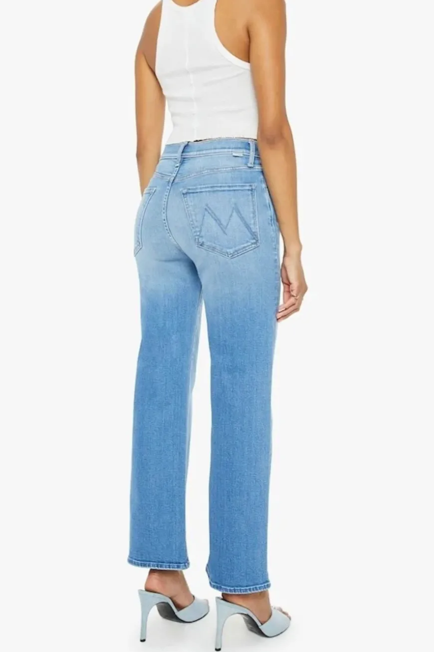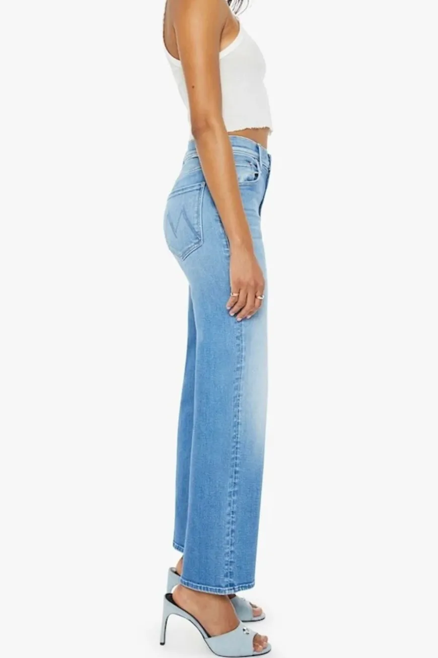 High-waisted jeans with a wide straight leg, zip fly and clean 28.25-inch inseam. Made from stretch denim, Read Between The Lines is a mid-blue wash with whiskering and fading at the knee.