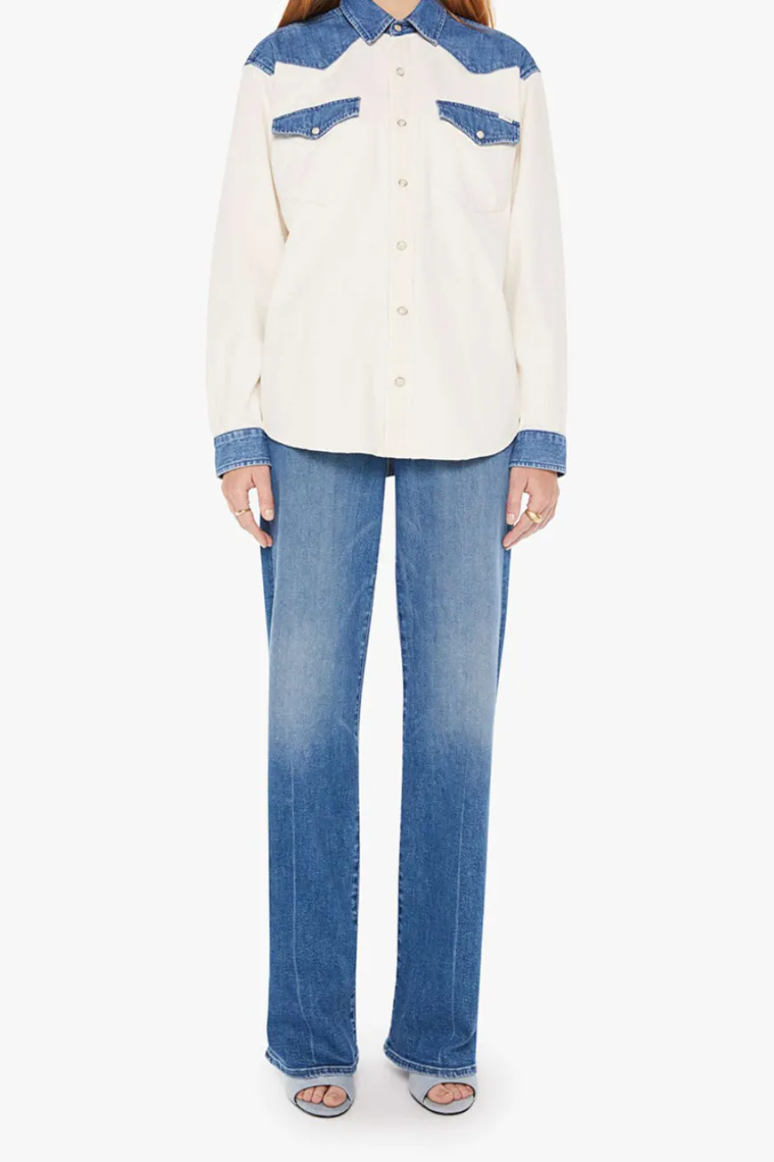 A Western-inspired denim button-up with patch pockets, a curved hem, and snaps down the front. Made from 100% cotton, the Tycoon in Shoulder To Shoulder is designed in off white with denim details at the shoulders, pockets and wrists.
